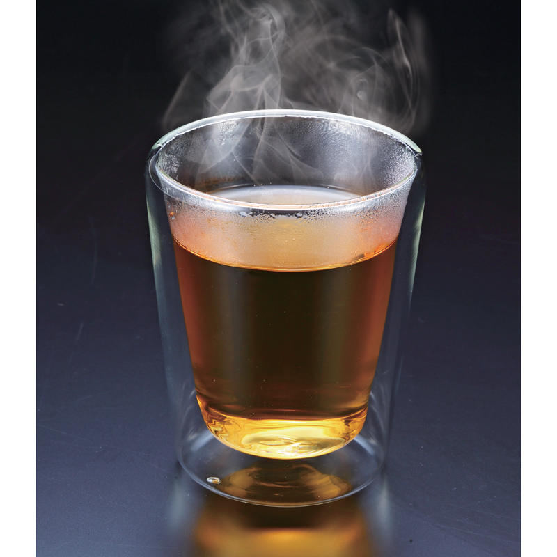 コーヒーなど色つきのドリンクを入れると一目瞭然ですが、ドリンクが浮いたように見えるユニークさが目を引きます。結露が起きにくい、持っても熱さを感じにくいという大きな特徴があります。夏は氷を入れて飲むことが多くなりますが、結露を起こすことでテーブルが濡れる、輪ジミができてしまう…そんなお悩みは日常茶飯事。ですが、二重構造がそのトラブルを解決してくれるので、コースター要らずで楽しんでいただけます。