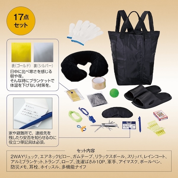 セット内容:2WAYリュック、エアネックピロー、ガムテープ、リラックスボール、スリッパ、レインコート、アルミブランケット、トランプ、ロープ、洗濯ばさみ10P、軍手、アイマスク、ボールペン、防災メモ、耳栓、ホイッスル、多機能ナイフ ※商品のセット内容、パッケージのデザインが変更になる場合がございます。 |
