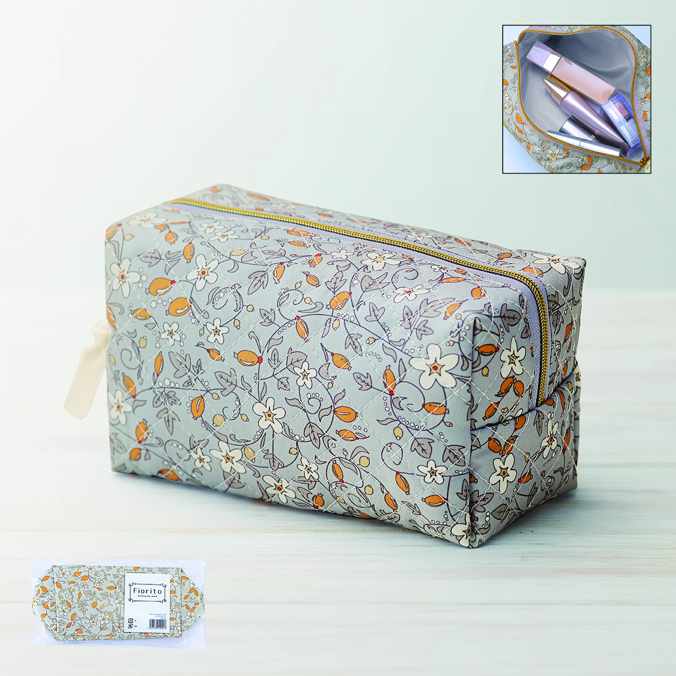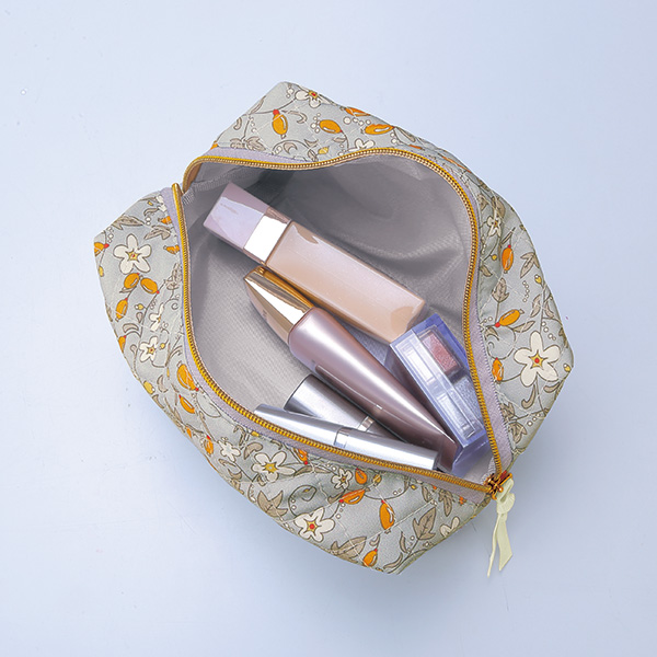 女性らしい華やかさと容量の多さ、存在感あるキルティング生地が魅力のボックス型ポーチ。