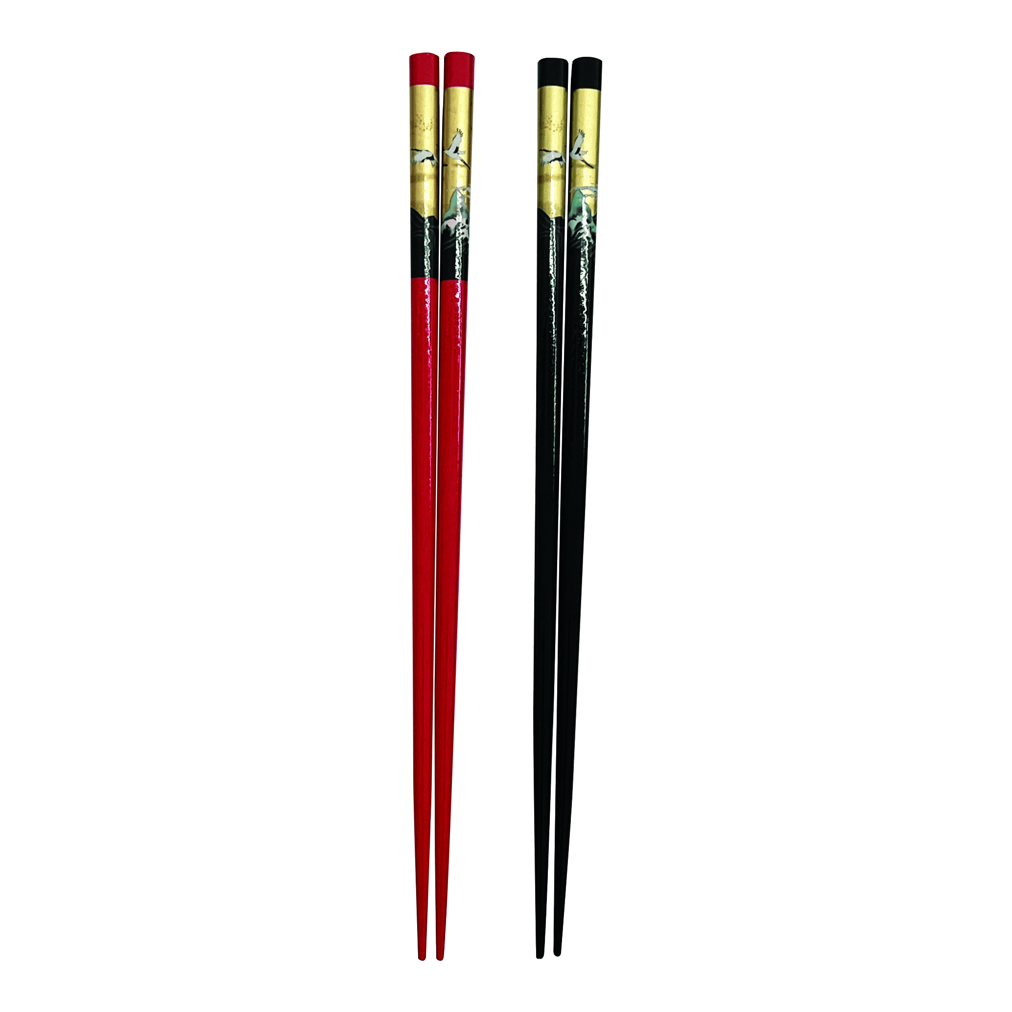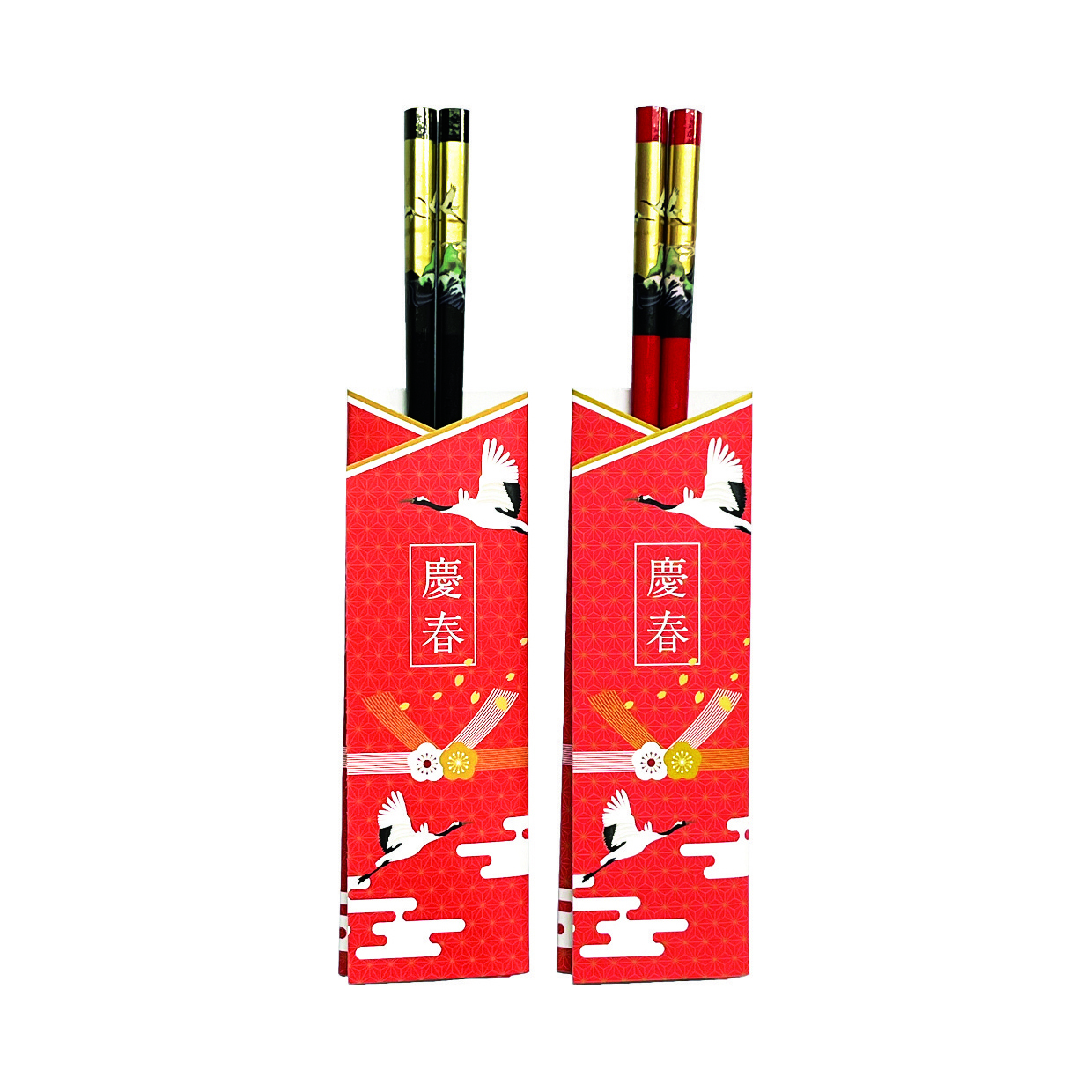 新年にふさわしい箸と慶春台紙の組み合わせ。縁起柄のひとつ、金鶴柄が目をひく美しい塗箸です。