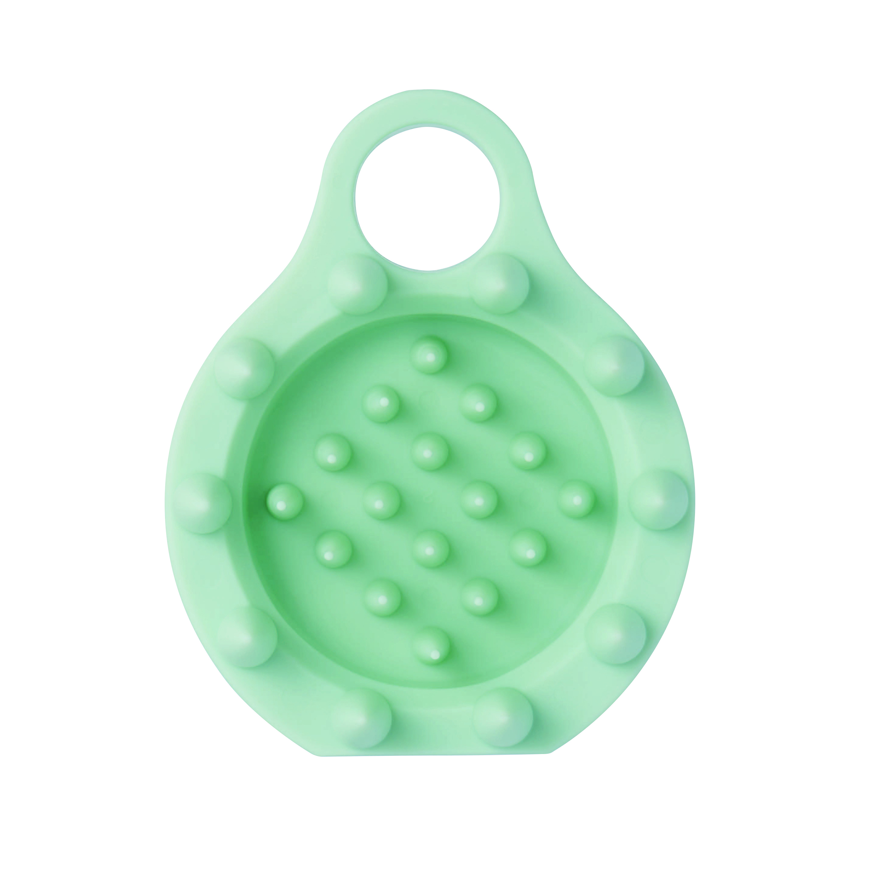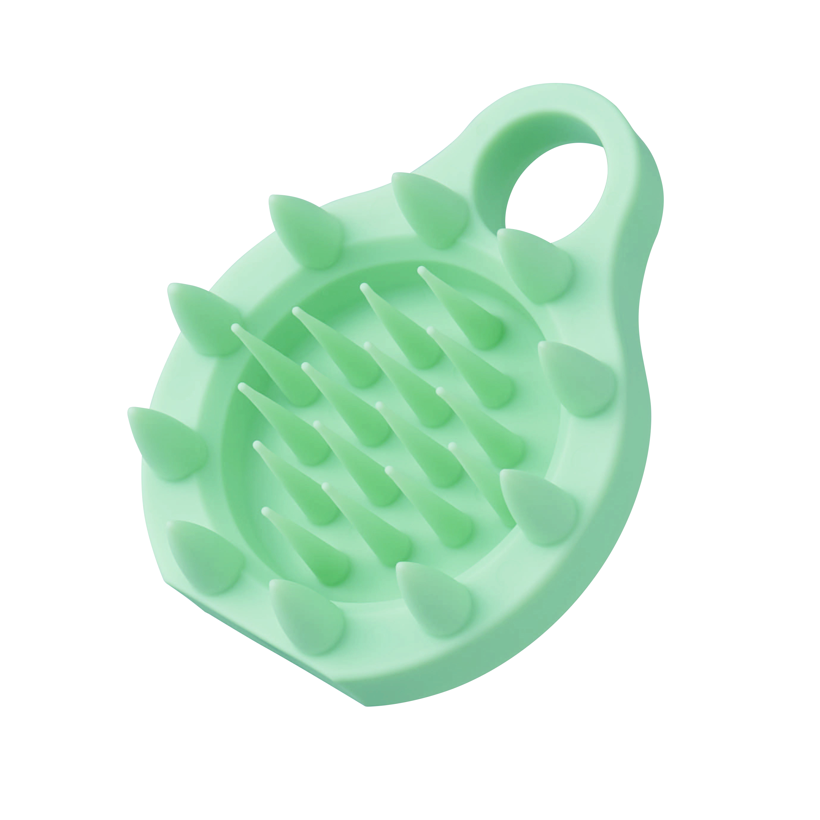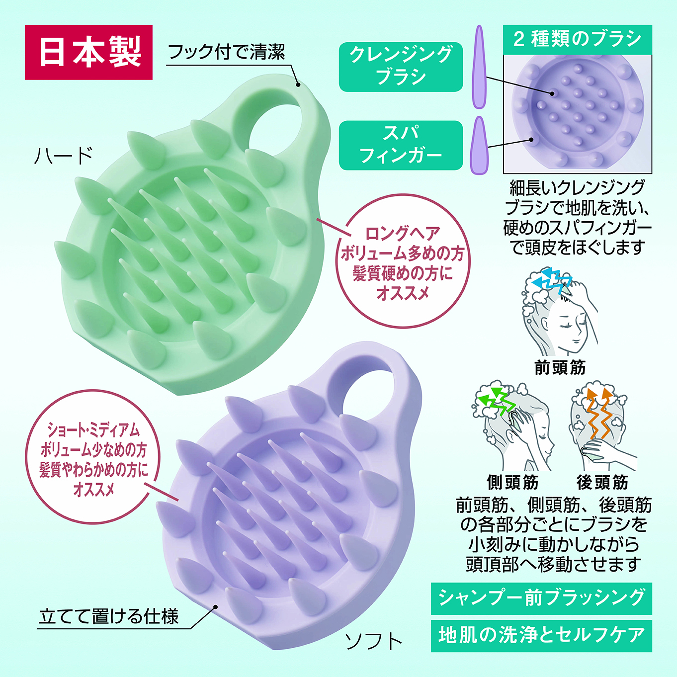 女性も握りやすいサイズ。太さの異なる2種類のピンが洗髪&頭皮ケアができるシャンプーブラシ。