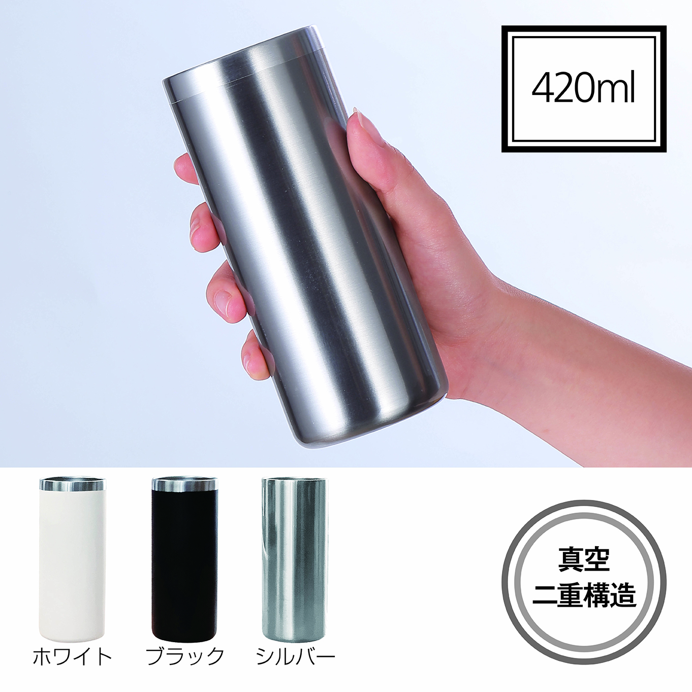アイスもホットもおまかせ。ストレートタイプで口径が小さいので長時間、飲み頃をキープする真空二重構造のオールシーズン使えるタンブラー。