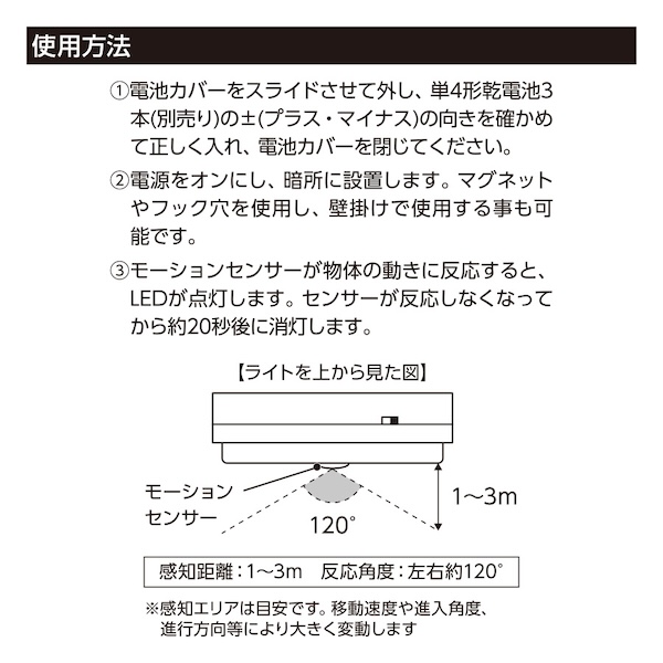 120°の範囲で、約1~3mの距離まで動きを感知して作動します。