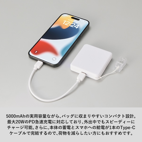 容量5000mAhかつ、最大20W出力で急速充電が可能なうえ、本体はコンパクトなサイズで、持ち運びに便利です。