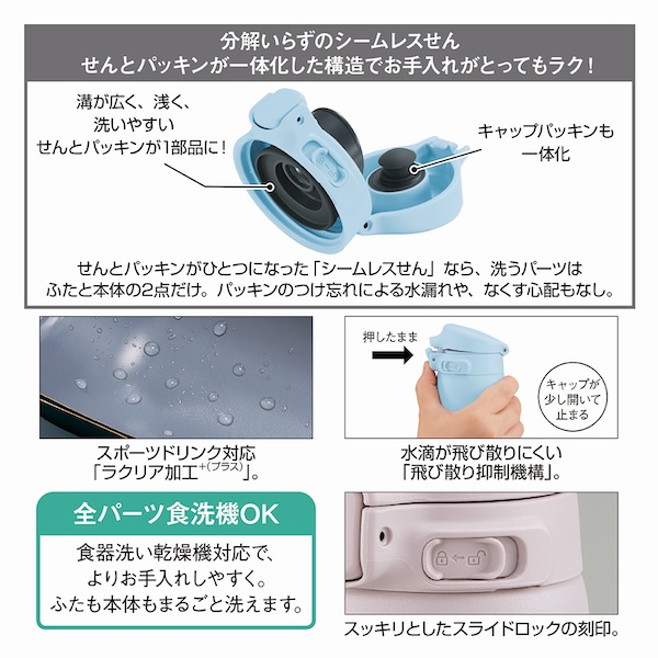 片手でOKのワンタッチオープン式。扱いやすさ、飲みやすさにこだわったシンプルボトルは、シーンを問わずオールシーズン大活躍!