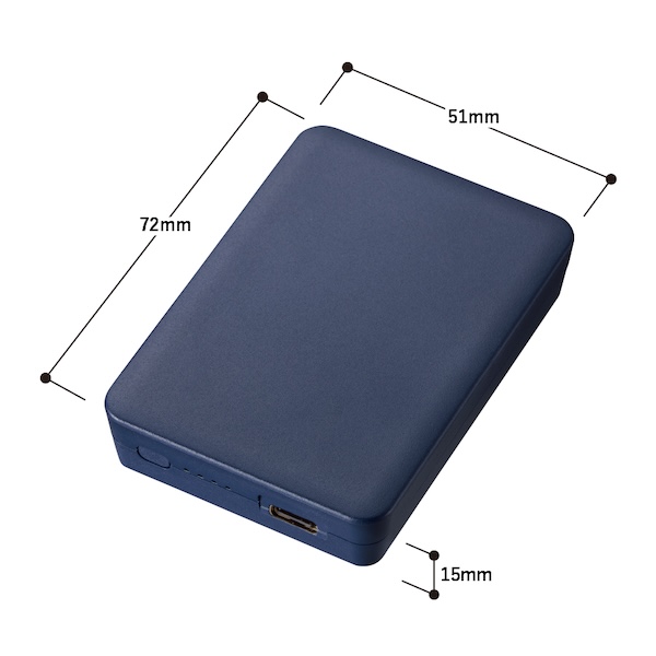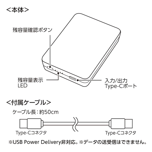 | 備考 | 取説付、最大出力1A、バッテリー容量2500mAh、本体重量約63g、Type-Cケーブル付属、残量表示ランプ付 |