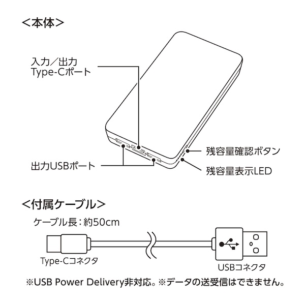 | 備考 | 取説付、最大出力2.1A、バッテリー容量2750mAh、本体重量約223g、Type-Cケーブル付属、残量表示ランプ付 |