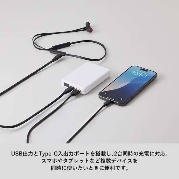 出力できるUSBポートと入出力ができるType-Cポートがついており、2台同時充電が可能かつ