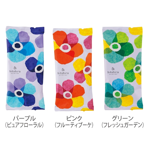 開けた瞬間ふわっとアロマが香る色付きウェットタオル。使用後もタオルとして使えます。