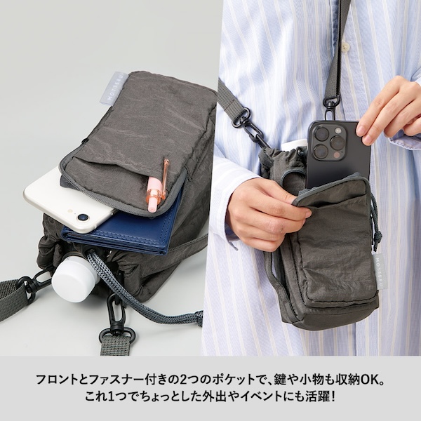 前ポケットとファスナー付きポケットの2つがついているため、