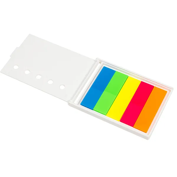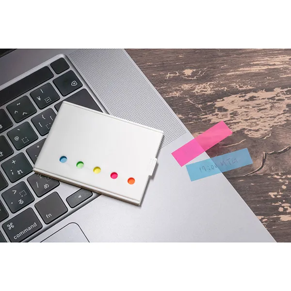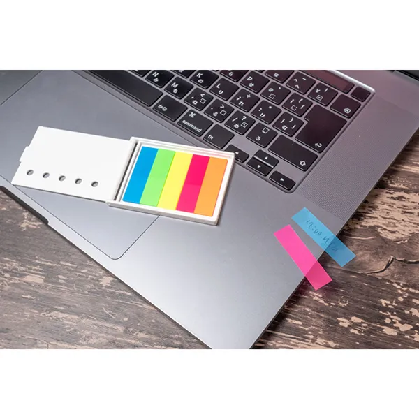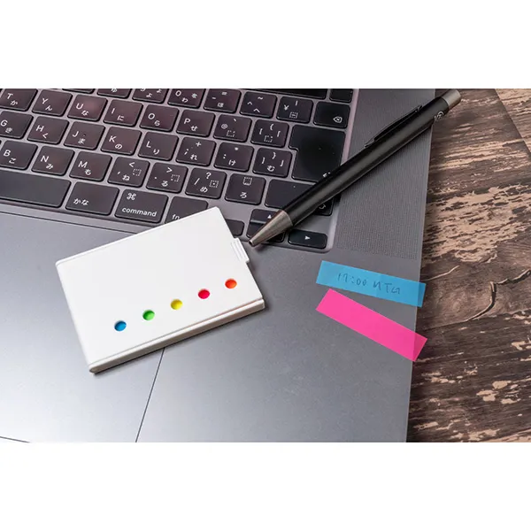ハードケースに5色のフィルム付箋をセット。フィルム素材なので紙よりも破れにくく、半透明だからメモや書類の上に貼っても下の文字をしっかり確認できます。書類整理やスケジュール管理、勉強用のマーキングなど、幅広いシーンで活躍。ビジネスパーソンから学生まで、誰に渡しても喜ばれるアイテムで、配布時にかさばらないコンパクト設計もポイントです。ケースに企業ロゴやメッセージを印刷することで使う度に目に入り、高いPR効果が期待できます。