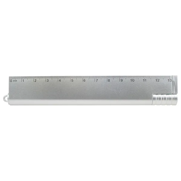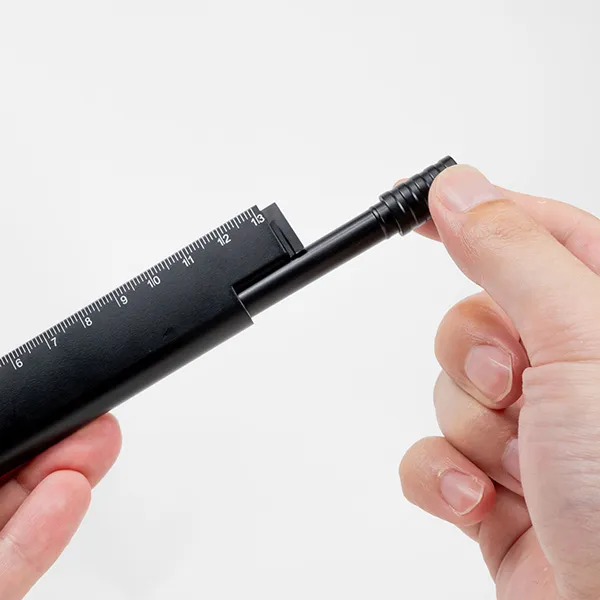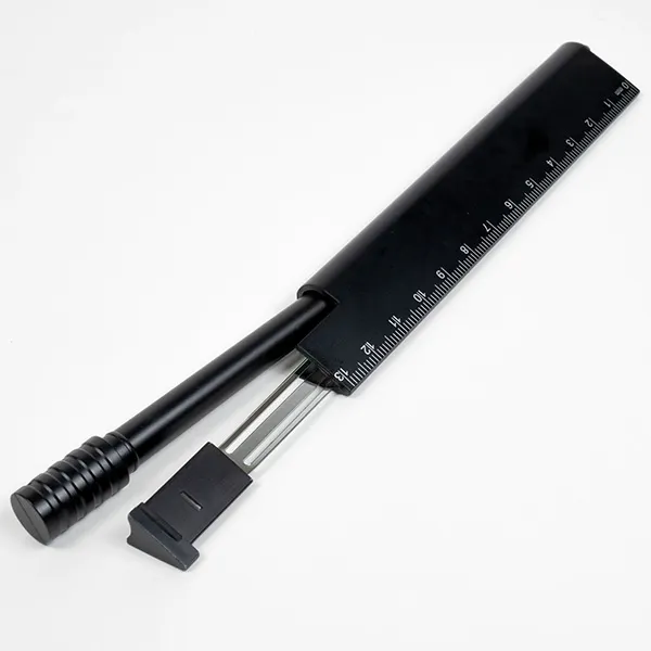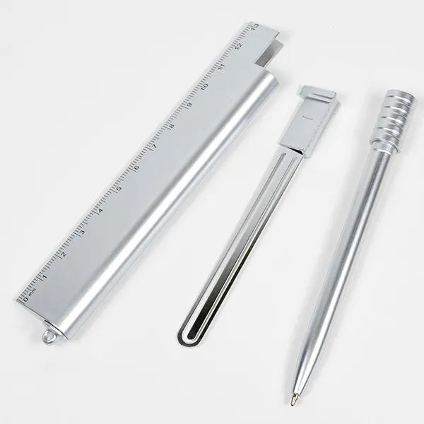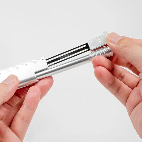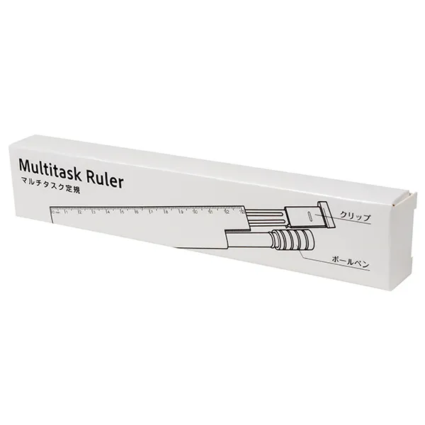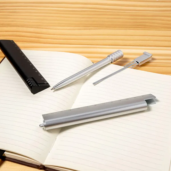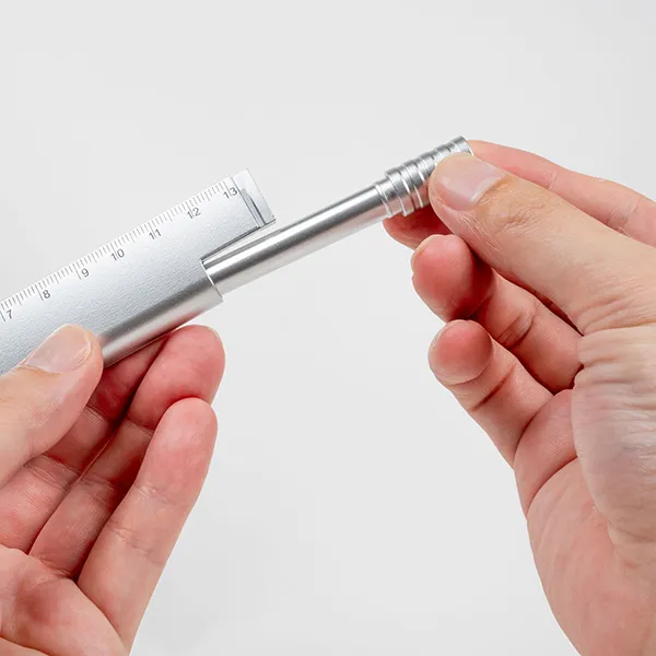 定規・ボールペン・クリップの3機能が一体となった実用性抜群のアイテム。本体側面のパーツを引き出すと内蔵されたペンとクリップがスマートに出現し、これ一つでメモ書き・資料整理・長さの測定までこなせる頼れるマルチツールです。ステンレス素材のシンプルでメカニックなデザインはビジネスシーンにもマッチし、知的で洗練された印象を演出。機能も見た目も妥協しない、大人のための販促アイテムとして、印象に残るノベルティをお探しの方におすすめしたい一品です。