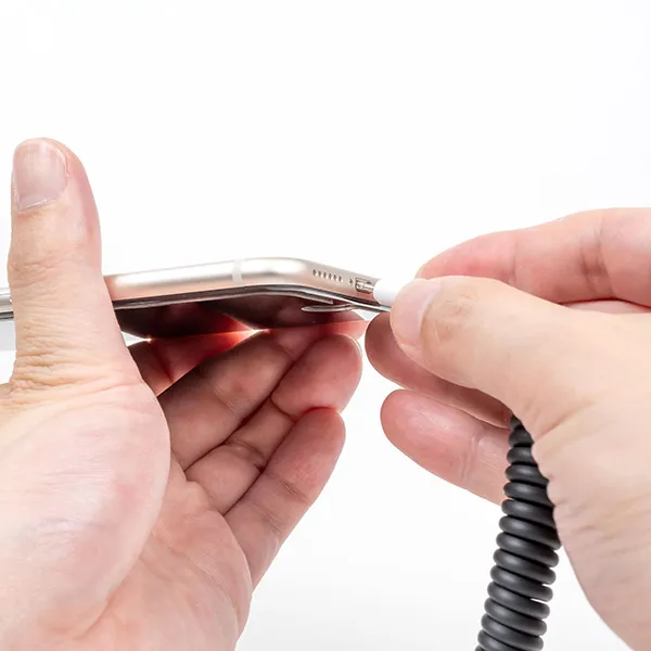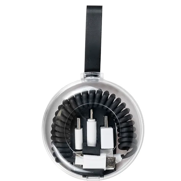 コンパクトなケースに収納されたスマートフォン用充電ケーブル。