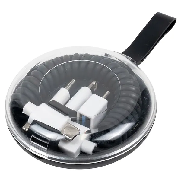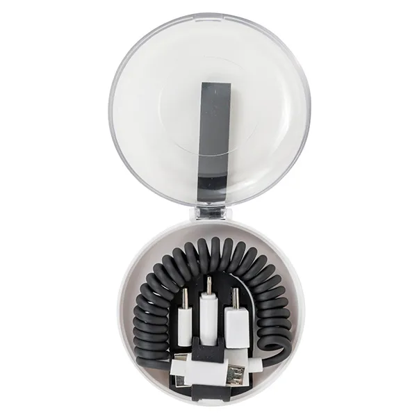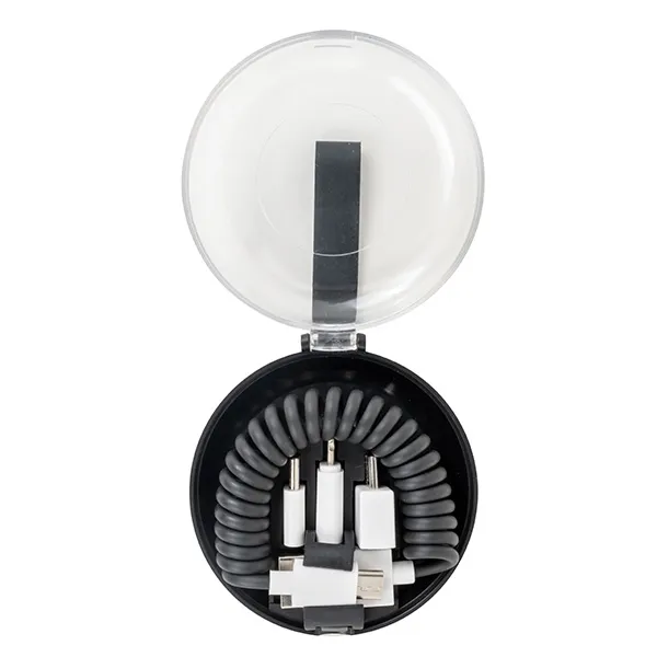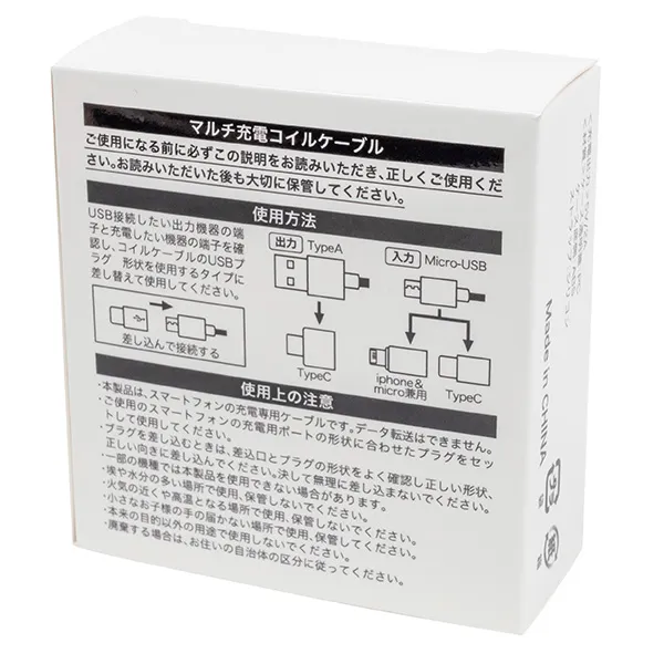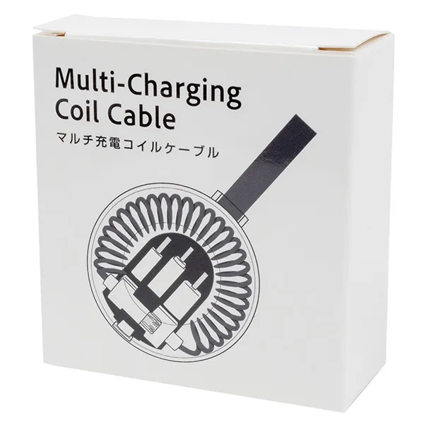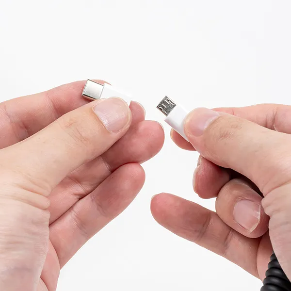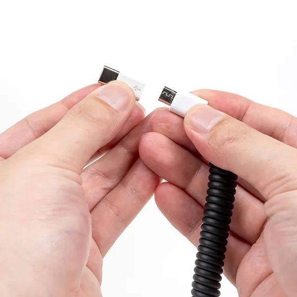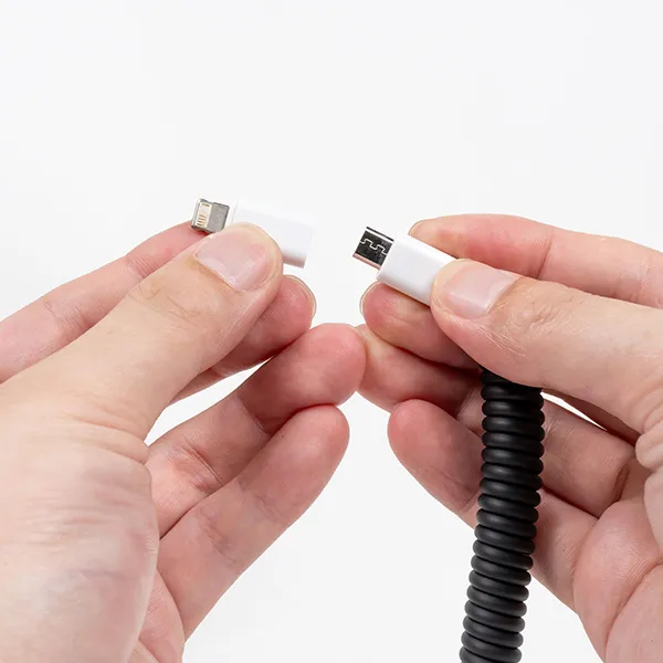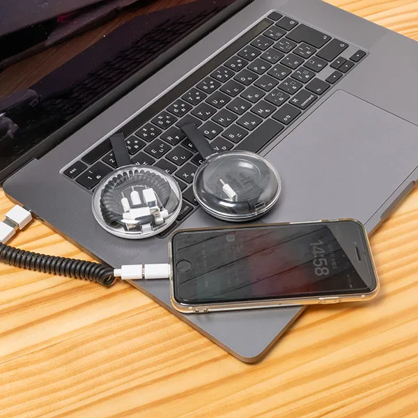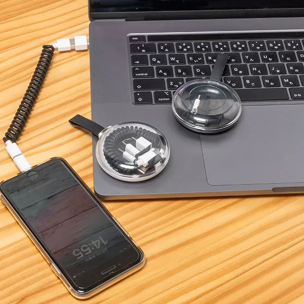 3種類の変換プラグ付きで様々なポート形状に対応します。伸縮性のあるコイル状ケーブルは、使用時は伸ばして快適に、収納時はコンパクトにまとめることができ、丸型ケースにすっきり収納できます。出張や旅行、外出先での充電に活躍し、実用性の高いノベルティとして企業イベントや展示会、販促キャンペーンにおすすめ。モバイル時代に嬉しい、喜ばれる一品です。