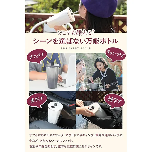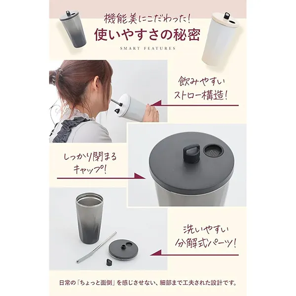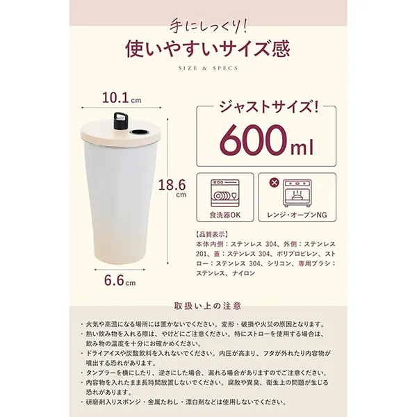 真空断熱で保温・保冷が長持ちするストロー付きタンブラー。600mlの大容量で直飲みもOK。食洗機対応でお手入れ簡単、日常からアウトドアまで幅広く使えます。