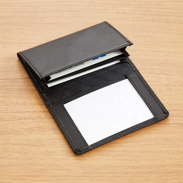 とっさのメモに活躍するメモホルダー付き。名刺整理に便利な2層式。