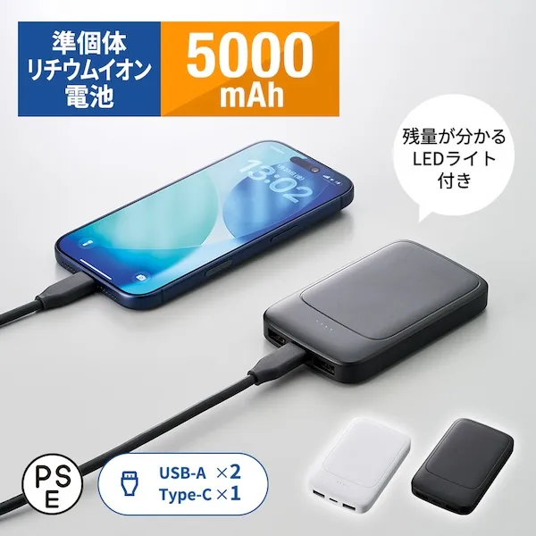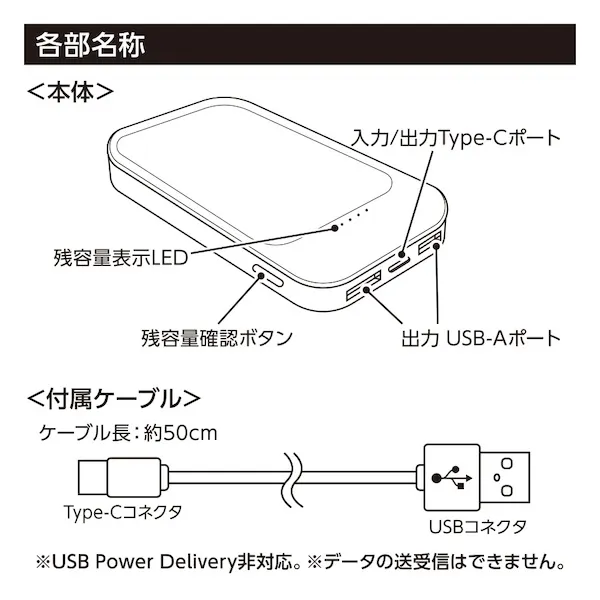 | 備考 | 取説付、最大出力2.4A、バッテリー容量5000mAh、本体重量約124g、Type-Cケーブル付属、残量表示ランプ付 |