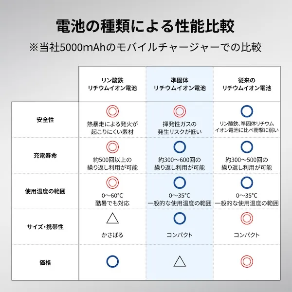 耐寒・耐暑性が高く、また電解液がゲル状なことでガスが一気に出にくいため、発火リスクが低くなっています。