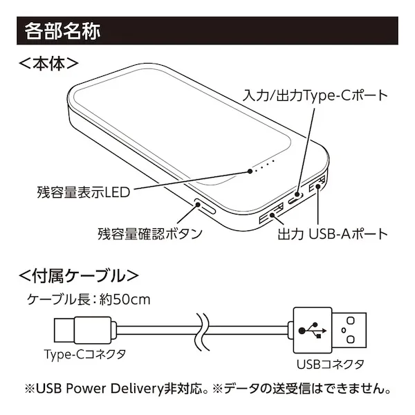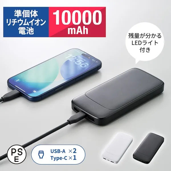 | 備考 | 取説付、最大出力2.4A、バッテリー容量10000mAh、本体重量約226g、Type-Cケーブル付属、残量表示ランプ付 |