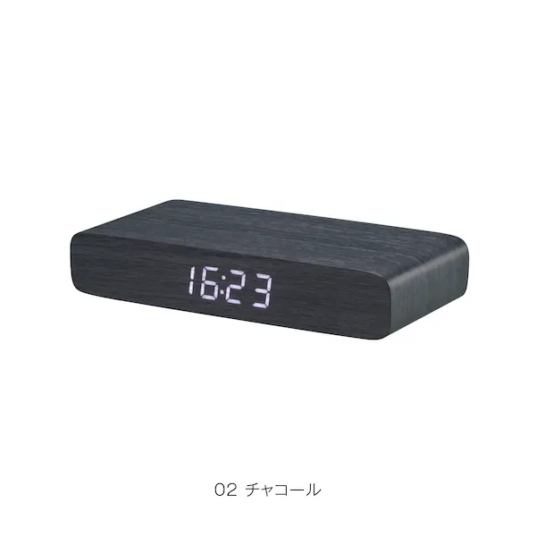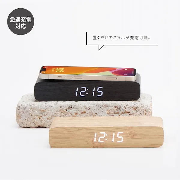 ワイヤレス充電機能の付いた、スリムな木製LEDクロック。