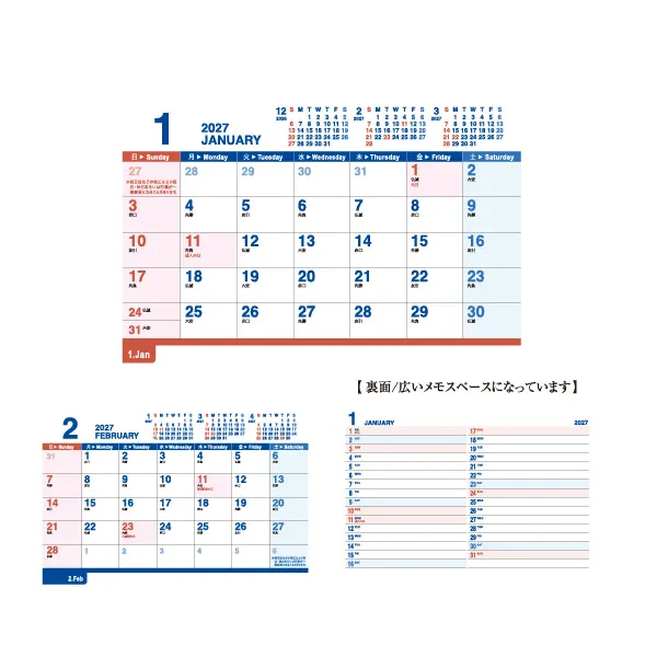 シンプルなデザインでメモ書きもしやすく裏面にはスケジュール管理に便利な広いメモスペースがついています。翌年の1月までカレンダーがついていて、一目でわかる年表が台紙に入っています。