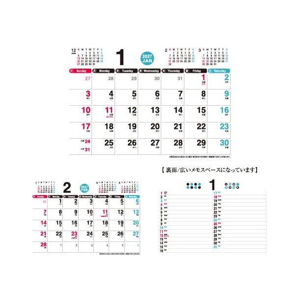 大きな文字で見やすく、裏面にはスケジュール管理に便利な広いメモスペースが付いています。翌年の1月まで入っています。