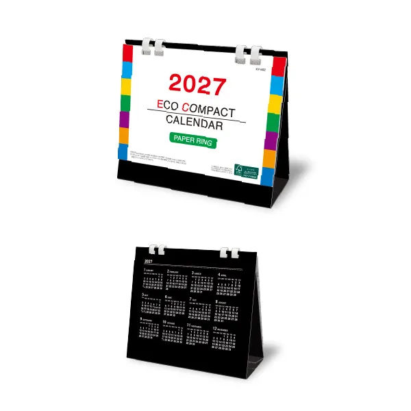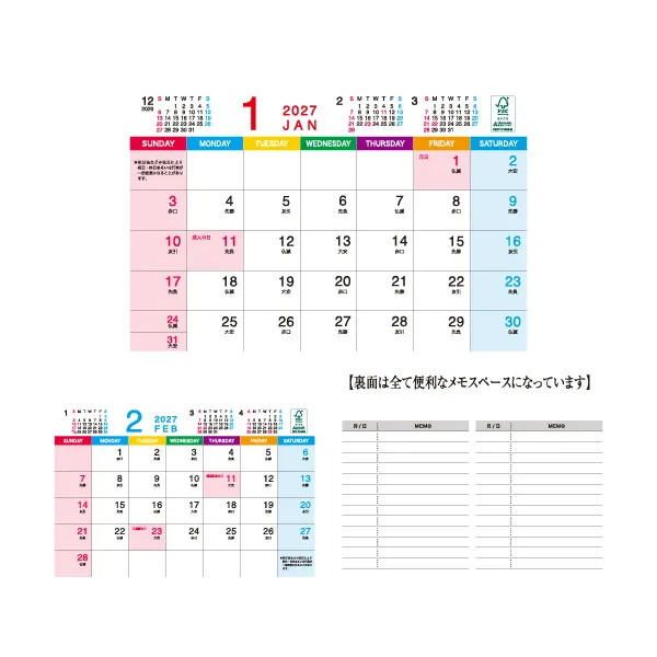 FSC森林認証紙を使用しています。森林の環境保全に配慮したカレンダーです。シンプルなデザインでメモ書きもしやすく裏面には便利なメモスペースが付いています。一目で分かる年表が台紙に入っています。