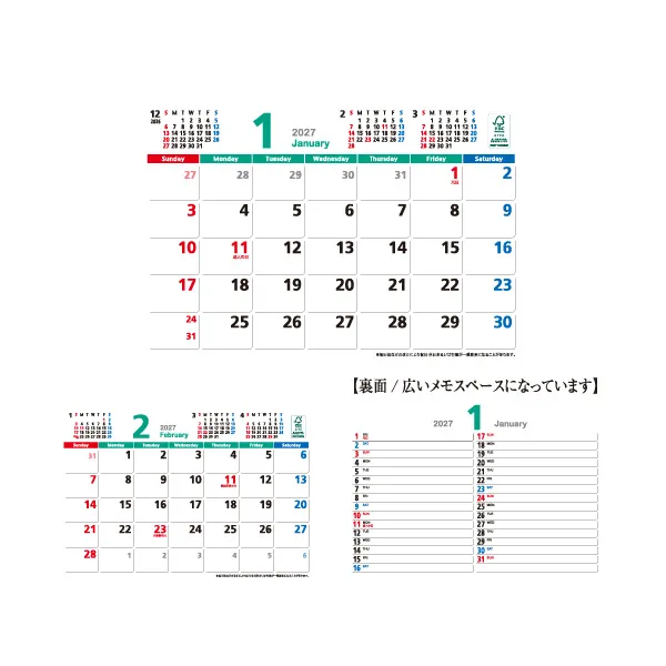 FSC森林認証紙を使用しています。森林の環境保全に配慮したカレンダーです。シンプルなデザインでメモ書きもしやすく裏面にはスケジュール管理に便利な広いメモスペースあります。一目で分かる年表が台紙に入っています。