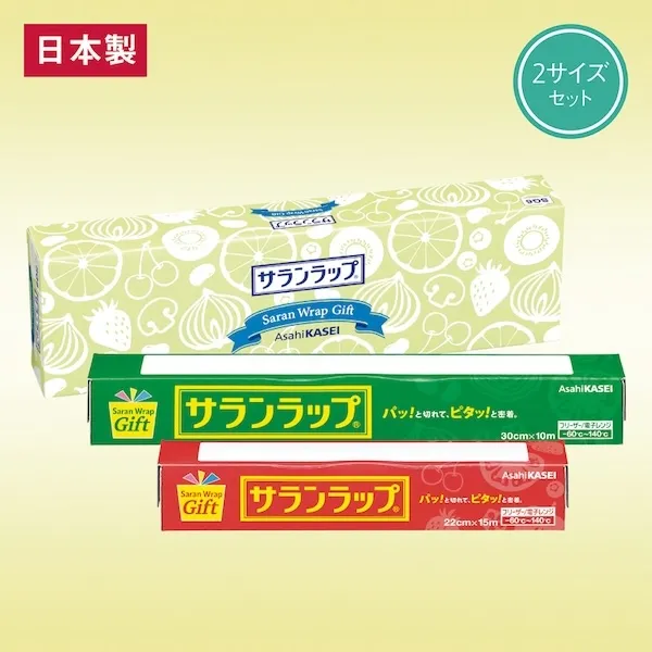 出番の多い幅30cm、22㎝のサランラップ2本セットの嬉しいギフトです。キッチンアイテムの中でも利用頻度の高い消耗品は特に人気が高く、1人暮らしやファミリー向け、学生や新社会人など幅広いターゲット層に喜ばれるノベルティです。企業や会社の販促品・ノベルティでお困りの場合、おしゃれで安いオリジナルのものをご提案します。