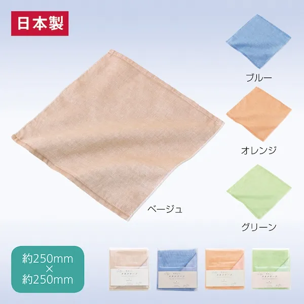 表面がガーゼ、裏面がパイルのタオルチーフ。極細糸で織り上げた、薄さと柔らかな風合いが特徴です。流行を問わず人気のタオルは、何枚あっても嬉しい、どなたにも喜ばれる販促品です。汗をかきやすい季節には特におすすめ!あらゆるイベントでお使いいただけます。企業や会社の販促品・ノベルティでお困りの場合、おしゃれで安いオリジナルのものをご提案します。