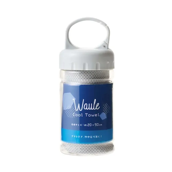 水に濡らすだけで、アウトドアやスポーツに最適なひんやり感。カラビナボトルで手軽に持ち運び。