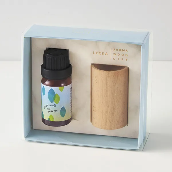 木製のアロマディッシュとアロマオイルのセットです。アロマディッシュに数滴垂らすだけで、優しい香りが広がります。