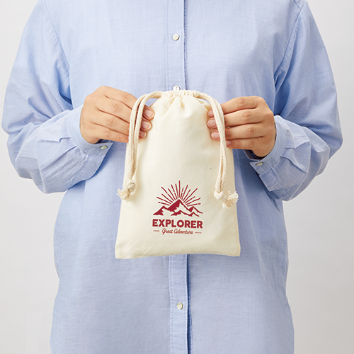 綿素材で使い勝手の良いコットン巾着です。やや薄手のシーチング生地で、旅行用の化粧品や、小物をまとめるのにちょうどよい大きさです。シンプルな巾着タイプは、デイリー使いにぴったり。口がきゅっと締まるので、カバンの中で中身が飛び出してしまう心配がありません。名入れ可能なので、イベントやノベルティにオススメの商品です。